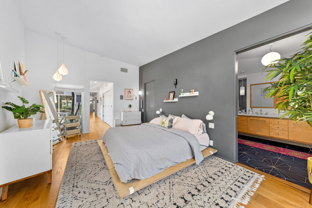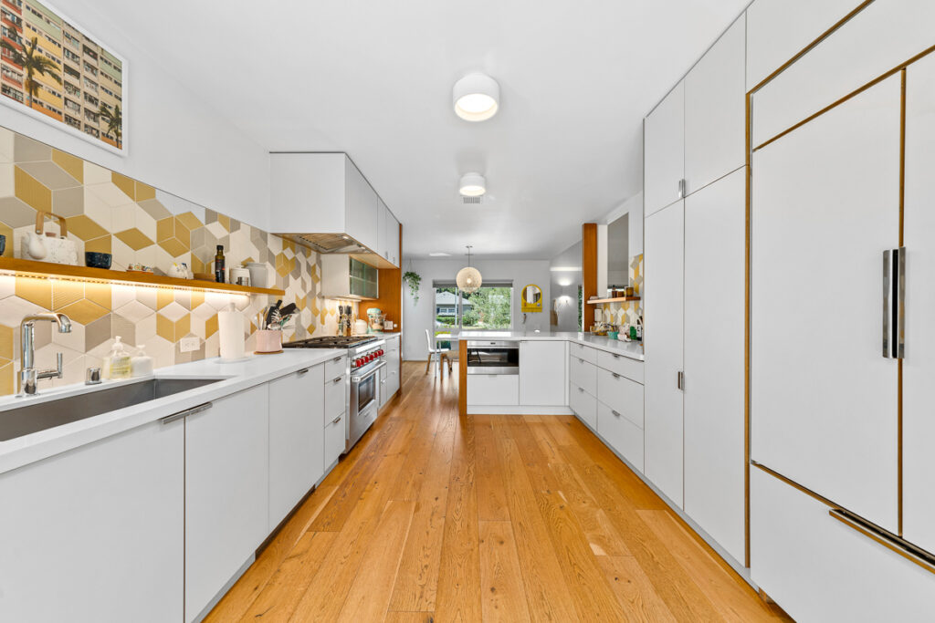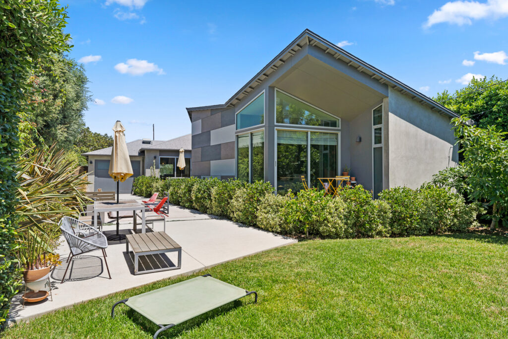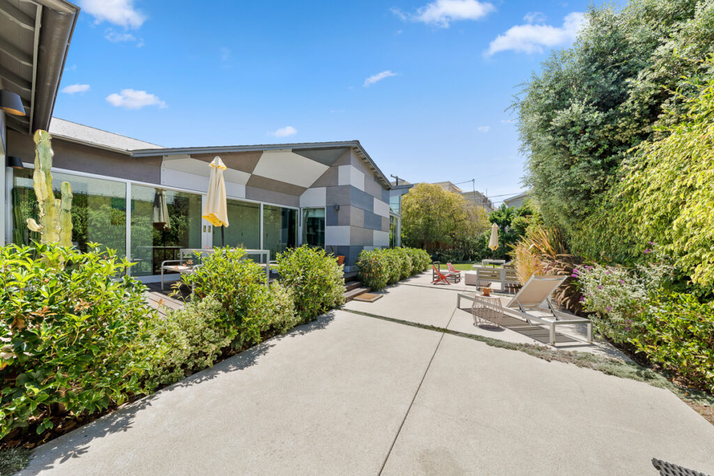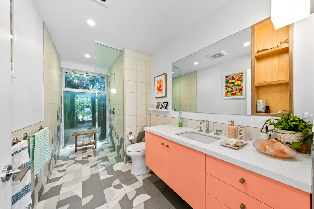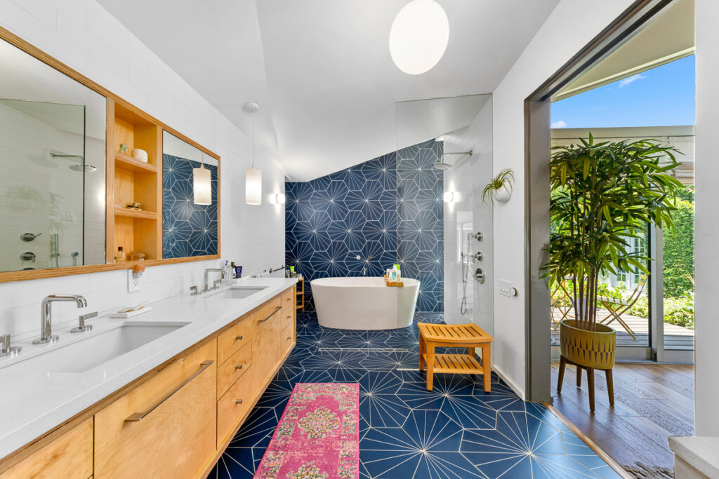 The living and dining areas have high slanted ceilings; they connect to a courtyard with an Ipe-wood deck area, a beautiful, seamless transition between indoor and outdoor living. The kitchen is designed in a galley style with a fun-filled, colorful backsplash of geometric porcelain tiles that create a light-filled feature in the space. The main bedroom takes advantage of the angled walls and floor-to-ceiling windows that lead to a small patio and a nice size yard. The main bathroom with a celestial feel with deep blue hexagonal porcelain tiles in the shower with a free-standing tub is situated in a partial wet room setup.