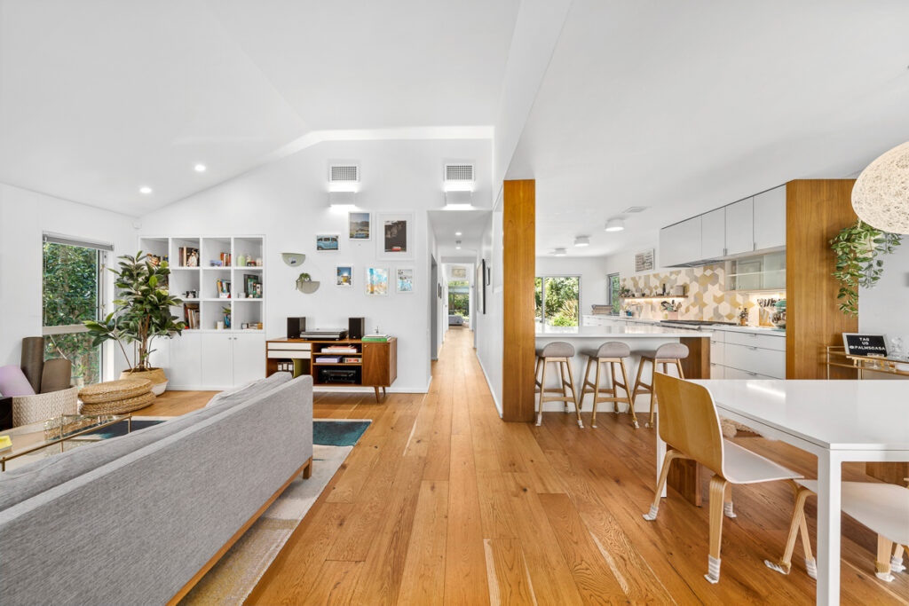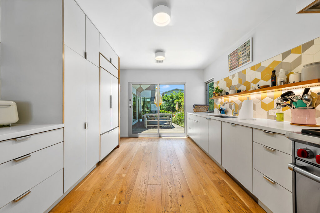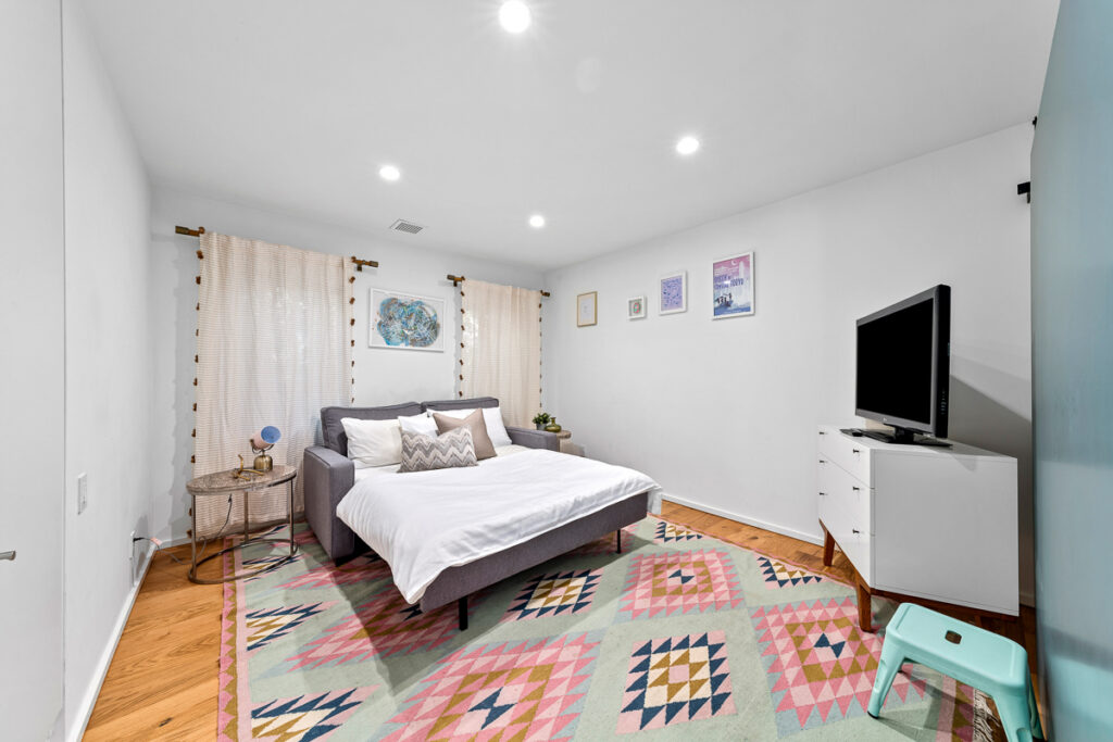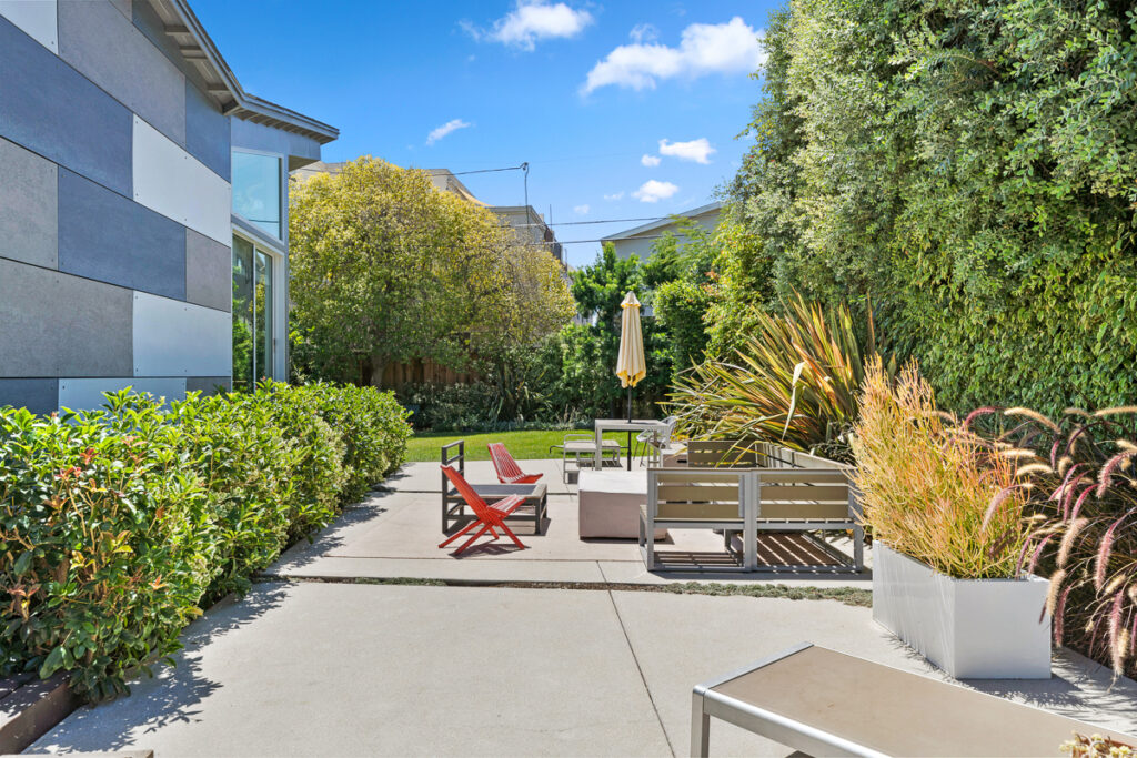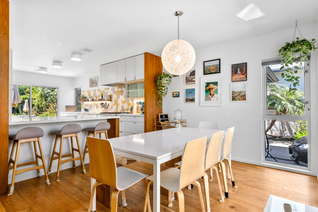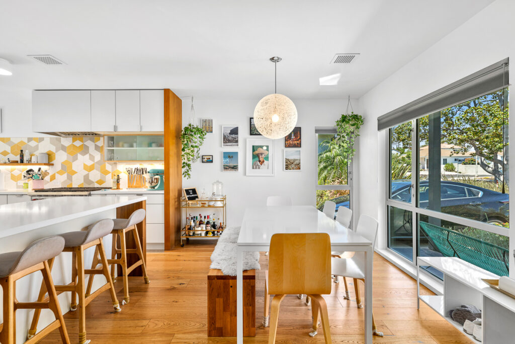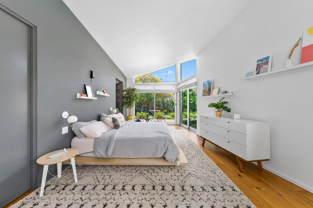 The living and dining areas have high slanted ceilings; they connect to a courtyard with an Ipe-wood deck area, a beautiful, seamless transition between indoor and outdoor living. The kitchen is designed in a galley style with a fun-filled, colorful backsplash of geometric porcelain tiles that create a light-filled feature in the space. The main bedroom takes advantage of the angled walls and floor-to-ceiling windows that lead to a small patio and a nice size yard. The main bathroom with a celestial feel with deep blue hexagonal porcelain tiles in the shower with a free-standing tub is situated in a partial wet room setup.